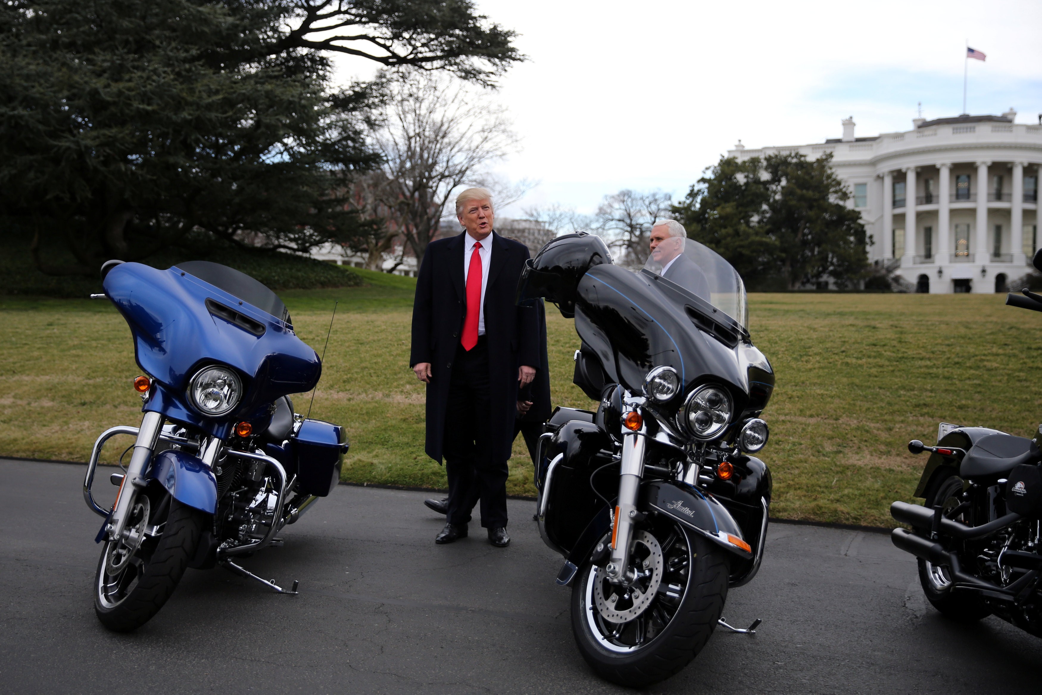 Em 2018, o presidente americano havia criticado a montadora por decisão de produzir fora dos EUA. Em queda de vendas, Harley apresentou resultados melhores que os previstos. Foto de 2017 mostra o presidente americano, Donald Trump, com motos da Harley-Davidson